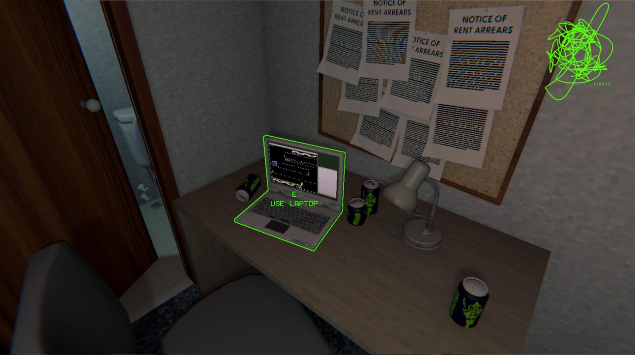 A screenshot from our new game, showing the laptop you can sit down at, and the “stress” meter in the corner.